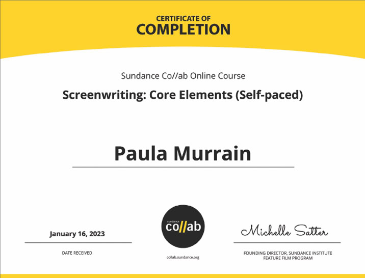 Paula was recently named a quarterfinalist in the 2023 Emerging Screenwriting’s competition, in addition to completing her certificate of completion of Sundance Co//ab’s Screenwriting course.
